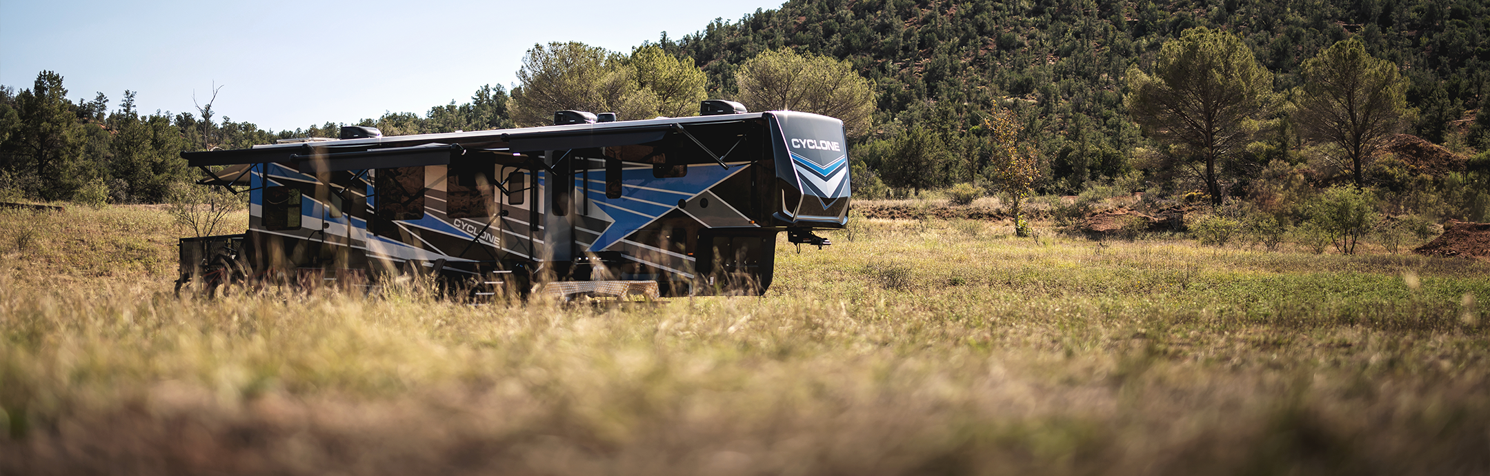 And Cyclone models include the industry’s largest fresh water tanks, so you can camp off-grid for longer. Take the Cyclone 4006, with a 150-gallon fresh water tank, an 85-gallon grey tank, and a 91-gallon black tank. It also comes with an 80-amp converter, a 5.5kW generator, two 30 lb. LP tanks, an 18 cu. ft. electric/gas fridge, and LED lighting throughout. All that combines to create an RV perfect for driving out to your favorite remote trails, where you can ride your ATVs or mountain bikes to your heart’s content.