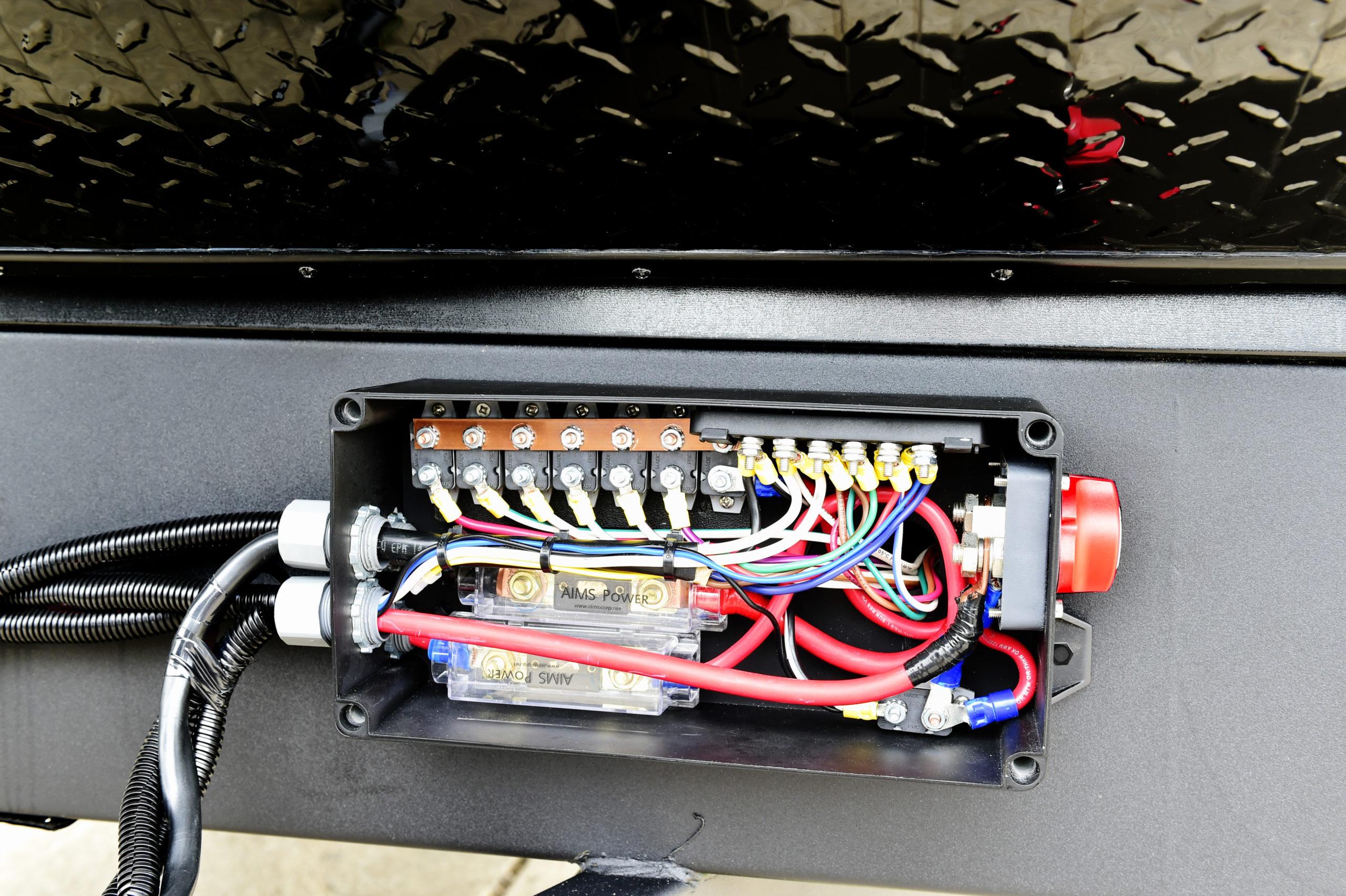 A single location for 12V wiring and power reset breakers.