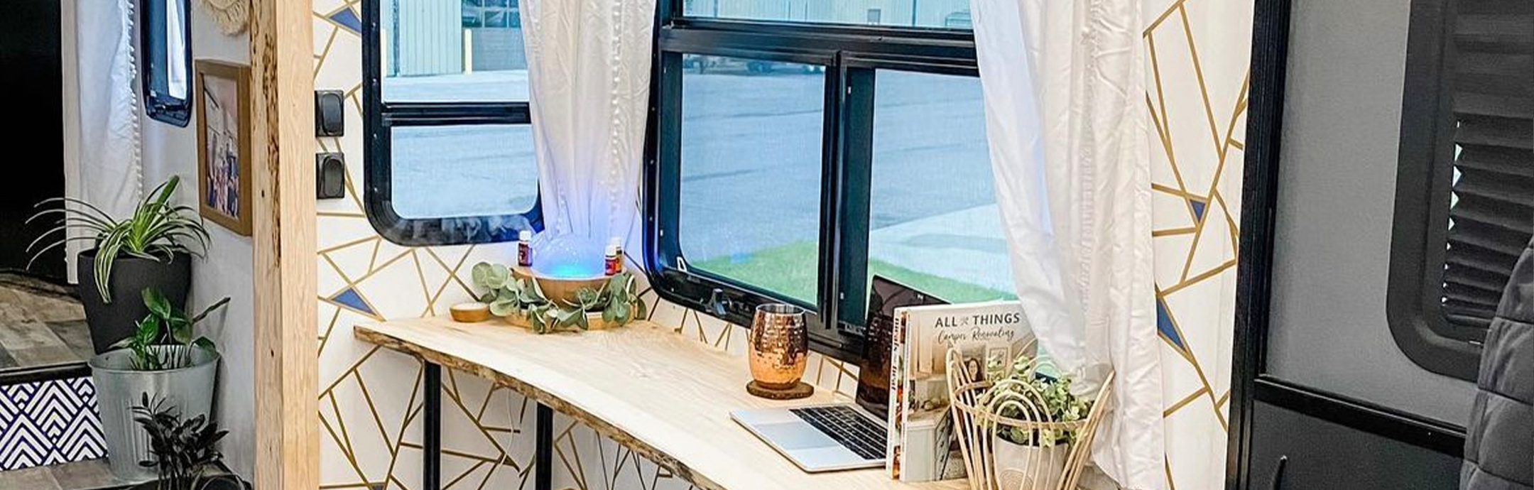 Another big consideration for working from the road is creating a quiet space to use for an office. I recommend choosing a larger RV, which gives you more options to spread out. You can use your dinette table as a desk, of course. But many fifth-wheel models include built-in desks, bunk rooms with second dinettes, and second bedrooms where you can take a call behind closed doors. And the open space in a toy hauler can easily be customized to make your ideal home office on the road. If you’re working with a smaller RV model or you want a secondary space, look into buying something like a Quick-Set Shelter by Clam to set up outside instead.