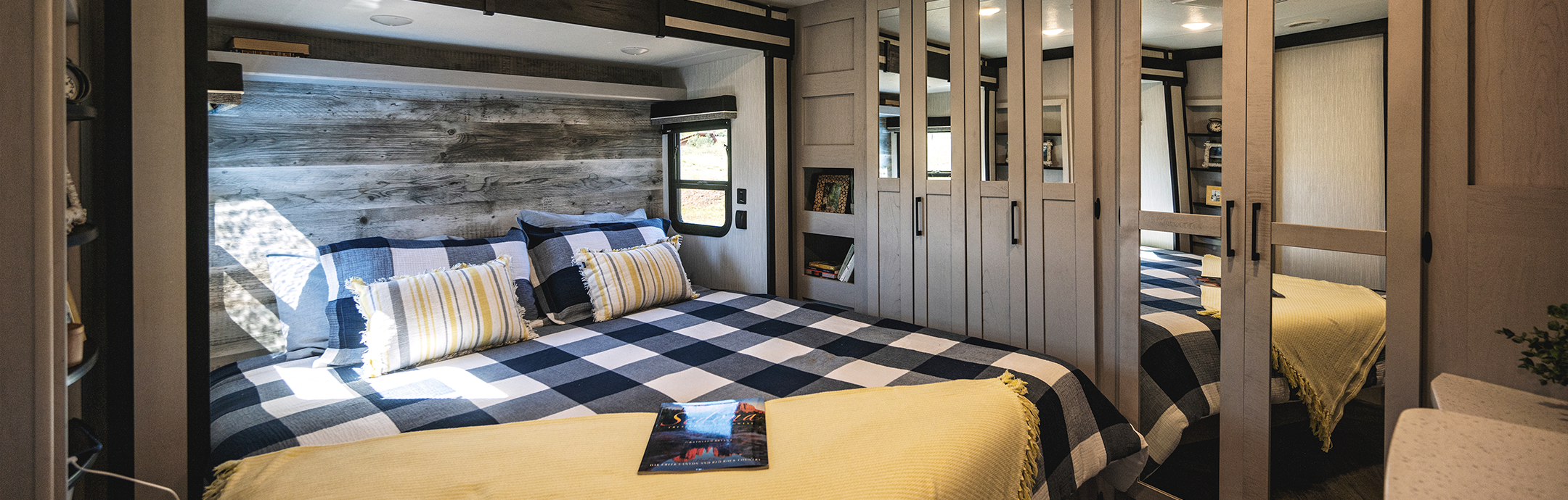 In the kitchen, solid surface countertops frame a wide, single-basin, stainless steel sink with a high-rise faucet that makes it easy to wash even your biggest pots and pans. There’s a generous pantry near the door, a residential microwave and stainless steel fridge, and a glass-top range with our new air fryer oven. The bathroom separates the rear bedroom from the living area, creating an added layer of privacy. And you’ll sleep like royalty on the king-sized gel-infused mattress, with plenty of storage on either side of the bed for your clothing and personal items.