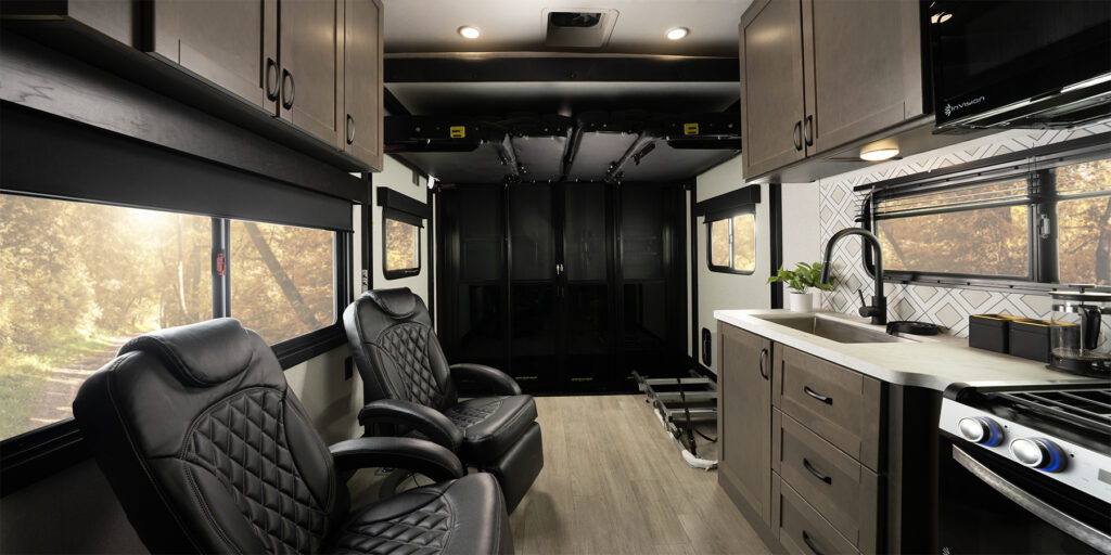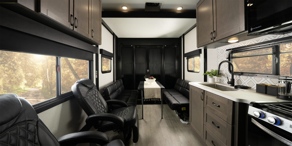 Core Shield aluminum-framed and vacuum-bonded laminated gel-coated fiberglass exterior walls and slide room end walls