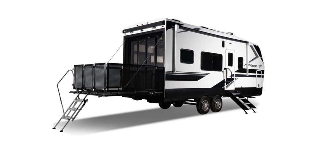 Weather-resistant rear ramp door and patio with anti-slip, non-skid flooring