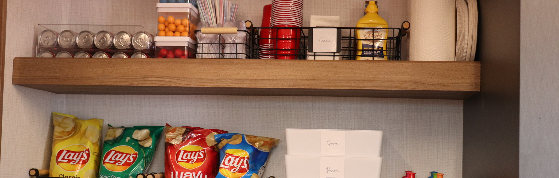 After you’ve created storage zones, go ahead and label them. This cabinet is for coffee supplies, that cabinet is for snack foods, and the drawer over there is for pens and paper. Even within zones, if you add any shelves, containers, or bins, you can label them with what goes inside. You could even add a symbol or graphic for each type of item if your kids aren’t old enough to read yet. Either way, everyone will always know what goes where, because the label will make it crystal clear.