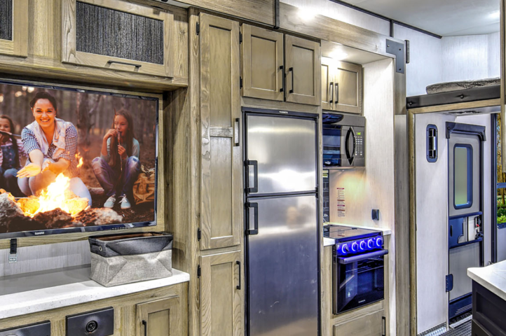 You also get a double-door fridge/freezer in the kitchen, alongside a microwave, double basin sink, pantry, and a gas cooktop and oven, so you can whip up something special. The pass-through storage gives you 52 cu.ft. of finished space to secure all your gear, and a flip-down rack makes it easy to store things like bikes, coolers and more.